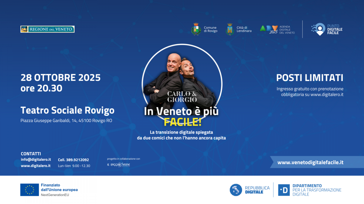 Il celebre duo comico Carlo & Giorgio arriva a Rovigo con lo spettacolo “In Veneto è più FACILE! – La transizione digitale spiegata da due comici che non l’hanno ancora capita”, in programma martedì 28 ottobre alle ore 20.30 al Teatro Sociale (Piazza Garibaldi 14). L’ingresso è gratuito, con prenotazione obbligatoria su Eventbrite fino a esaurimento posti.